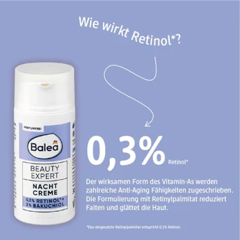 Balea Beauty Expert propose des soins efficaces aux ingrédients concentrés, parfaitement adaptés à vos besoins, pour une peau éclatante. Le bakuchiol est une alternative végétale au rétinol. Ensemble, ils assurent une amélioration efficace de l’état de la peau. La crème de nuit, composée de 0,3 % de rétinol* et de 2 % de bakuchiol, pénètre en profondeur dans les couches supérieures de l’épiderme et hydrate intensément. Sa formule hautement efficace réduit la profondeur des rides**, améliore l’élasticité de la peau** et favorise sa régénération. Formulé sans microplastiques ni polymères hydrosolubles purement synthétiques. *Le palmitate de rétinyle utilisé correspond à 0,3 % de rétinol. **Étude in vivo auprès de 20 testeurs après 4 semaines d’utilisation. pH : 4,8 – 5,8. Produit conforme au Guide Balea Clean Beauty –