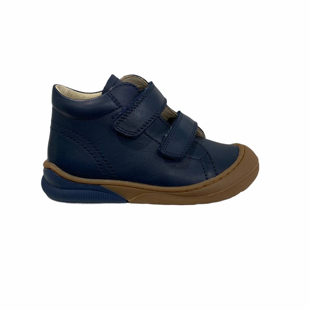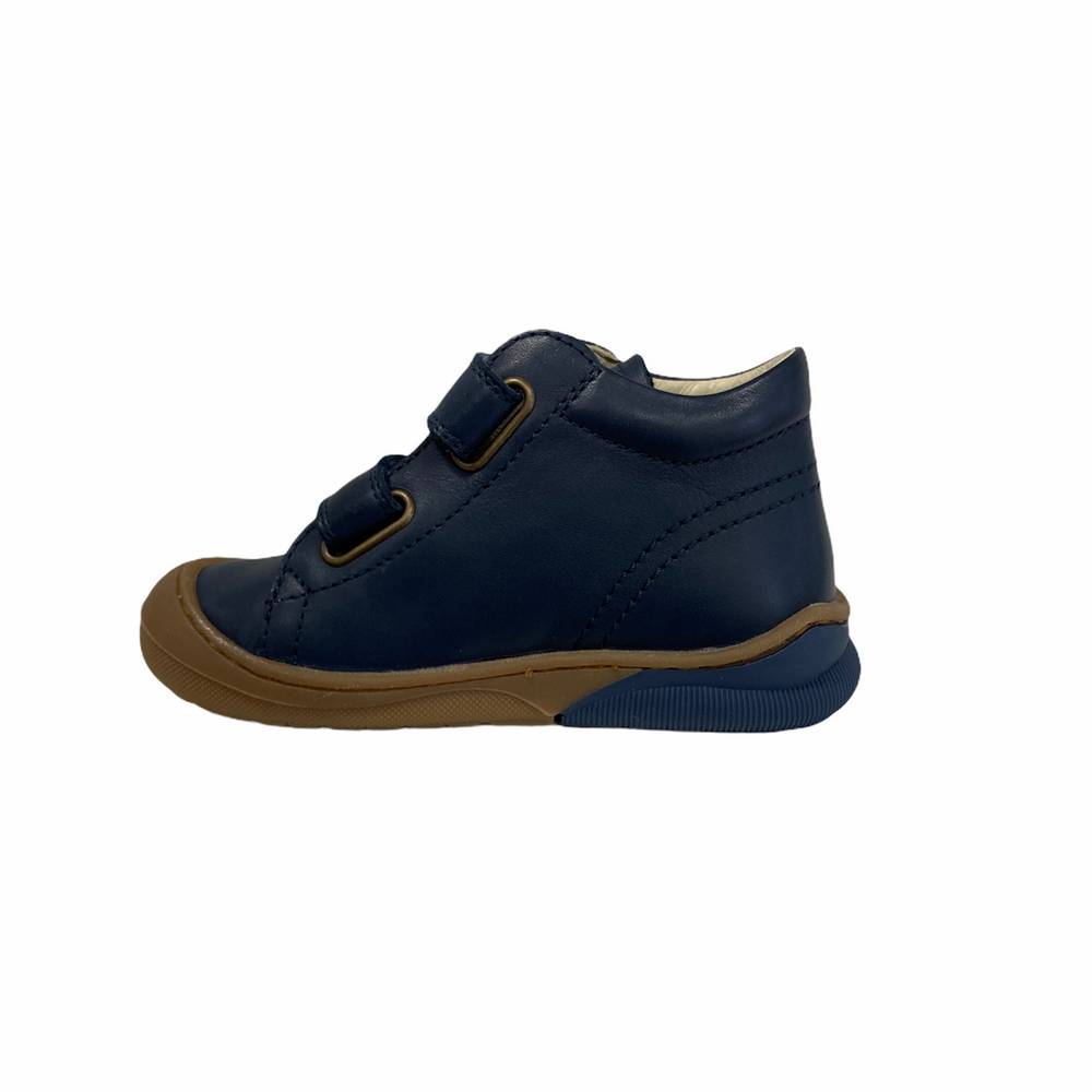 Chaussure montante en cuir, doublure interne en cuir pour que les petits pieds soient parfaitement au chaud et confortables. Les surpiqûres parcourent l’ensemble de la tige, avec une couleur contrastée sur le talon.