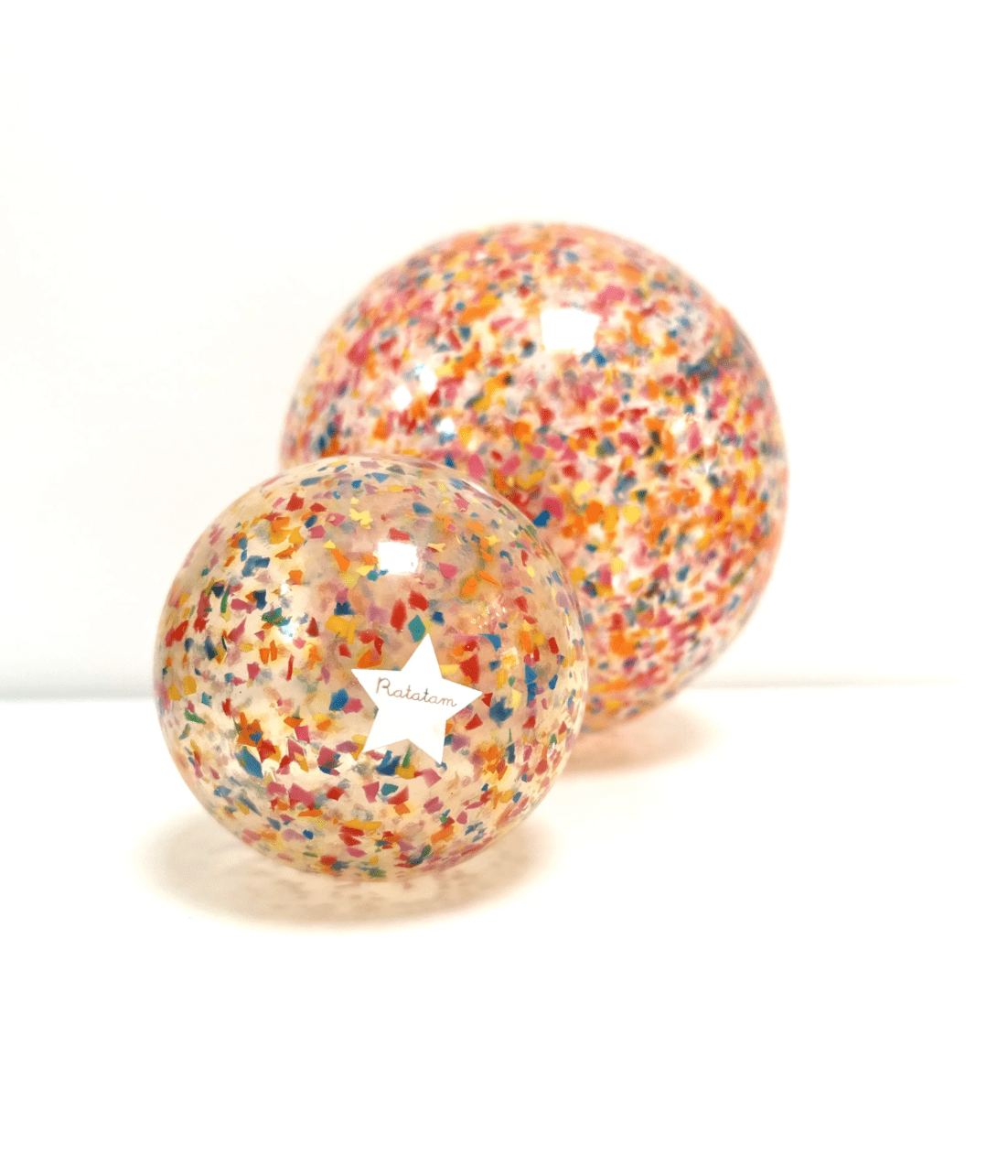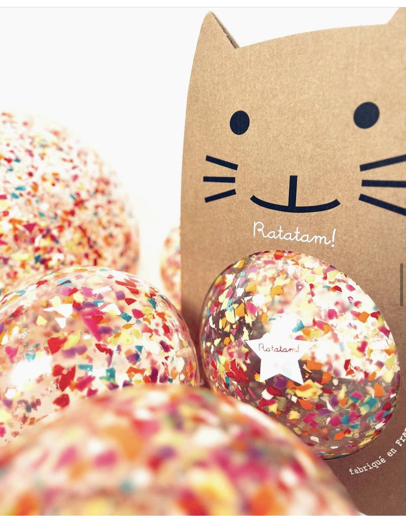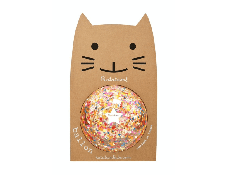 Voici la nouvelle collection colorée de ballon Ratatam kids Confetti ! On craque pour son design sobre mais fun avec ses confettis colorés, issues des chutes de ballons broyés puis réutilisées dans la matière. Fabriquée en France en matière recyclée, ce ballon léger et résistant s’utilise aussi bien à l’intérieur qu’en extérieur (au jardin, à la plage, au parc …). Avec son emballage chat trop mignon, c’est aussi une chouette idée de cadeau !