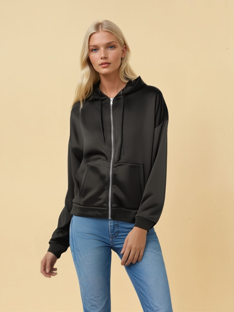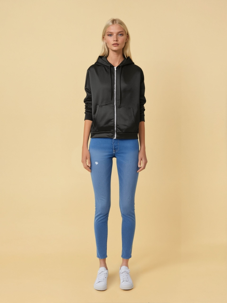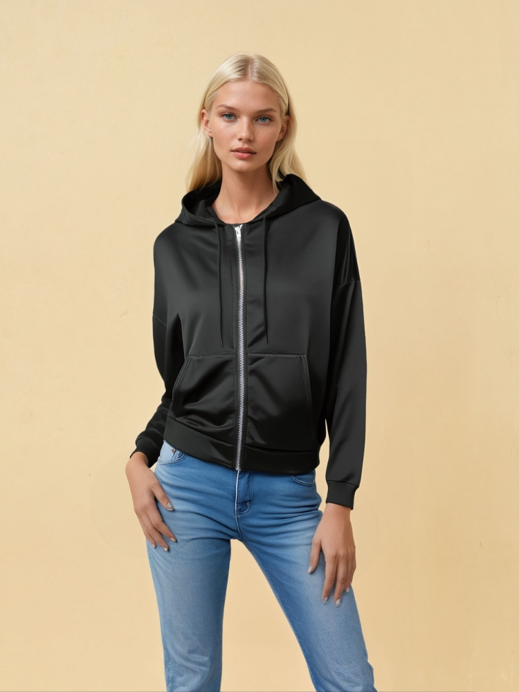 Notre sweat zippé noir classique et moderne est le choix parfait pour celles qui recherchent une pièce à la fois élégante et fonctionnelle. Ce sweat zippé est idéal pour compléter une tenue décontractée tout en apportant une touche de modernité. Son look minimaliste le rend facile à porter.